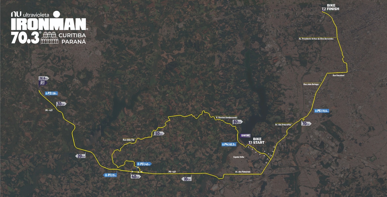 Em Araucária, depois da prova de natação na represa do Passaúna, os atletas montam nas bicicletas e saem pela Rua Pelicano, seguindo pela Doutor Valério Sobania, Avenida das Araucárias, Avenida dos Pinheirais, Rua Cesário Furman e entram na PR-423 próximo à Rua Teodoro Augustyn, já em Campo Largo.