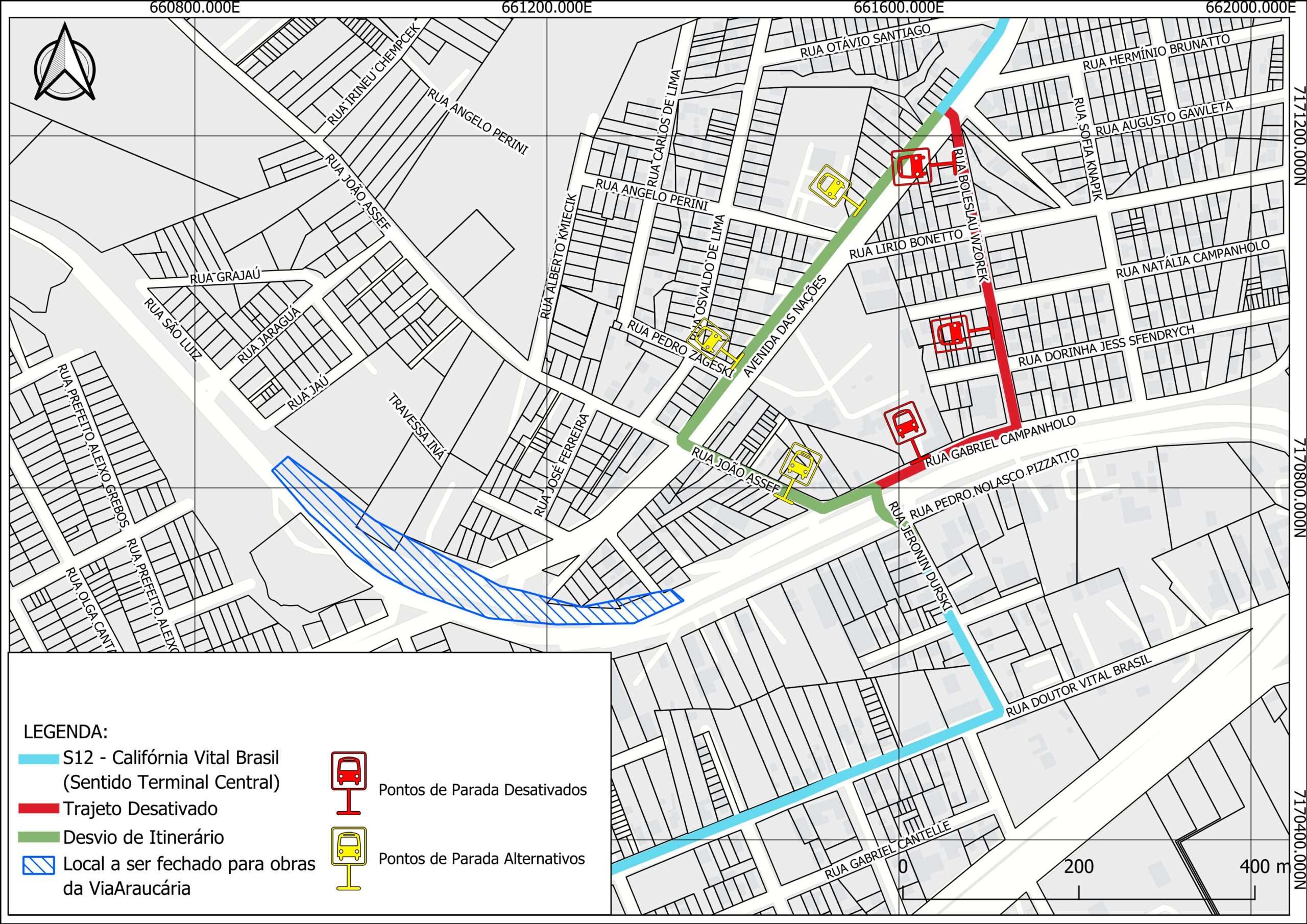 Califórnia /Vital Brasil (S12) – sentido Terminal Central: Os ônibus que seguem pela Avenida das Nações vão continuar o trajeto e entrar na João Assef, cruzar a rodovia e entrar na Rua Jeronin Durski. Com isso, a linha deixa de passar pela Rua Boleslau Wzorek, cujos pontos ficam desativados. Este trecho da Avenida das Nações passa a ter mais duas paradas, e outra na João Assef.
