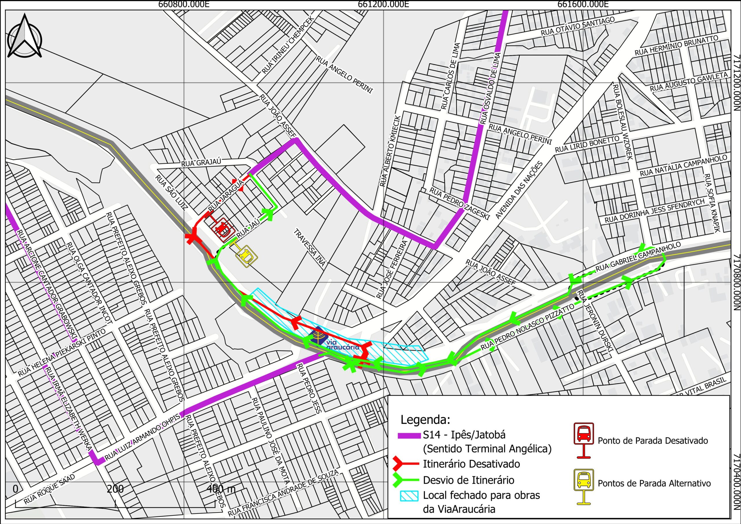 Ipês/Jatobá (S14) – sentido Terminal Angélica: Os ônibus que seguem pela Rua Luiz Armando Ohpis até a “Rotatória do Parafuso” e entram na PR-423 na pista sentido Campo Largo. Na sequência, acessam a Jaú, Travessa Iná, Jaraguá e entram na João Assef para continuar o trajeto normalmente.