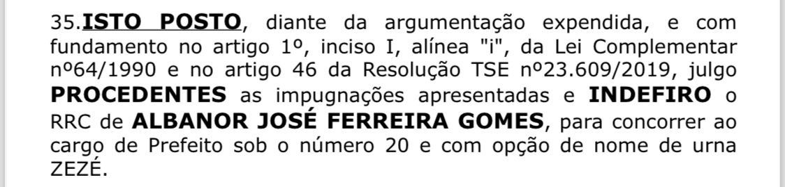 Justiça Eleitoral – Indeferimento Zezé