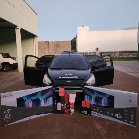 Dando continuidade à vistoria realizada no automóvel, a equipe encontrou uma variedade de mercadorias que não possuíam a devida regularização fiscal. Entre os itens apreendidos estavam 12 frascos de perfumes de diferentes marcas, televisores de 49 polegadas, tablets, smartwatches e smartphones. Além disso, foram encontrados medicamentos para disfunção erétil, bem como calçados e produtos de higiene pessoal.