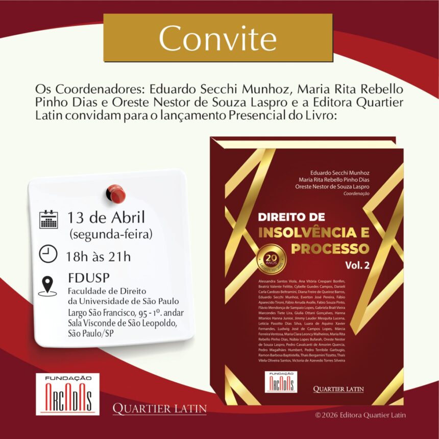 Na próxima segunda-feira, dia 13 de abril, o Grupo de Estudos Avançados de Recuperação Judicial e Falência da Fundação Arcadas promoverá o lançamento do segundo volume da obra coletiva intitulado Direito de Insolvência e Processo. O evento ocorrerá na Sala Visconde de São Leopoldo, situada na Faculdade de Direito da Universidade de São Paulo (FDUSP), às 18h.