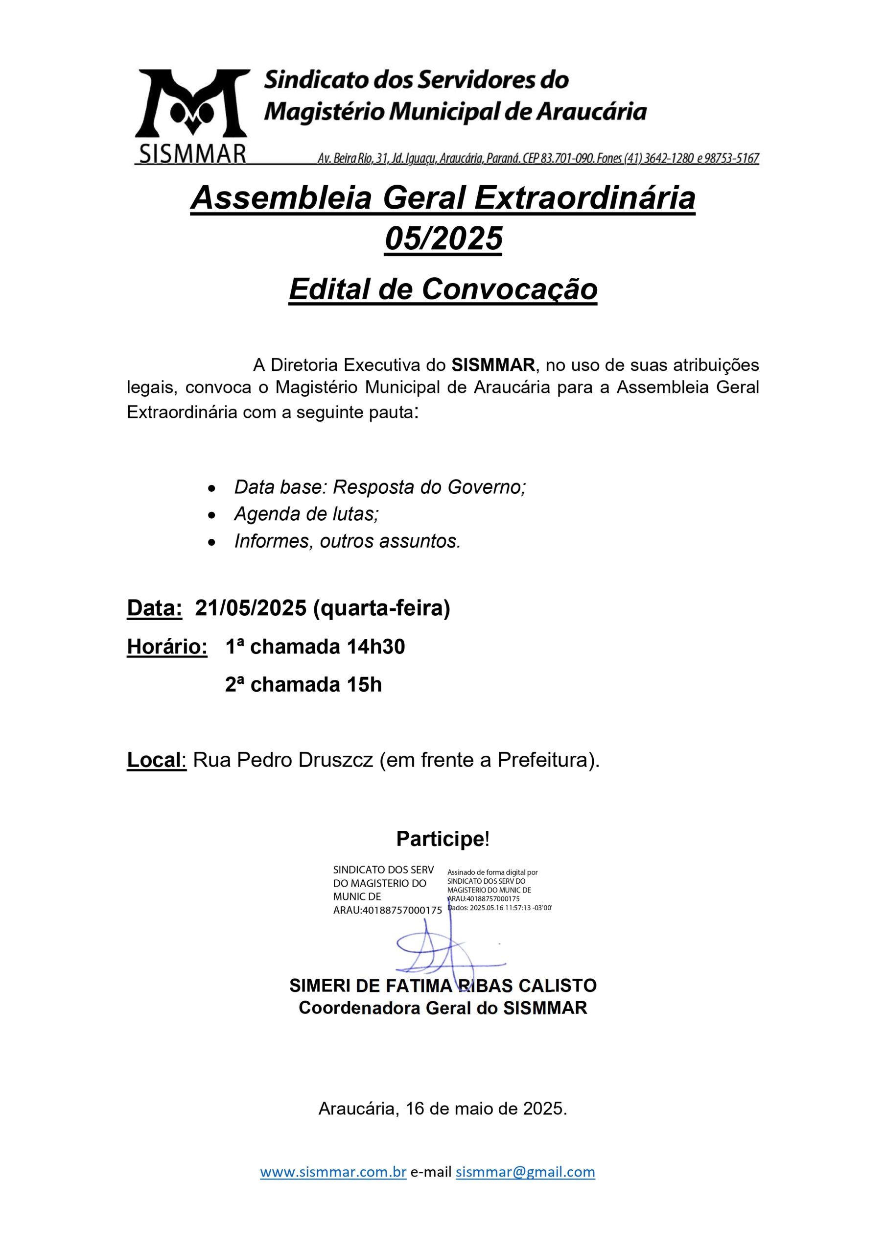 O Sindicato dos Servidores do Magistério Municipal de Araucária (SISMMAR), publicou nesta sexta-feira (16), o edital de convocação para a Assembleia Geral Extraordinária, que irá acontecer na próxima quarta (21/05), a partir das 14h30, em frente a Prefeitura de Araucáriar, na rua Pedro Druszcz.