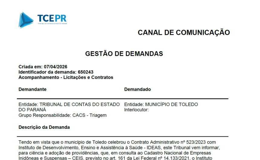 O que sempre foi denunciado como improviso travestido de solução, agora ganha carimbo oficial. O Tribunal de Contas do Estado do Paraná acaba de jogar a última pá de terra sobre o já combalido Instituto IDEAS — aquele mesmo que chegou a Toledo cercado de desconfiança, embalado por discurso político e sustentado por uma narrativa que nunca se confirmou na prática da saúde pública.