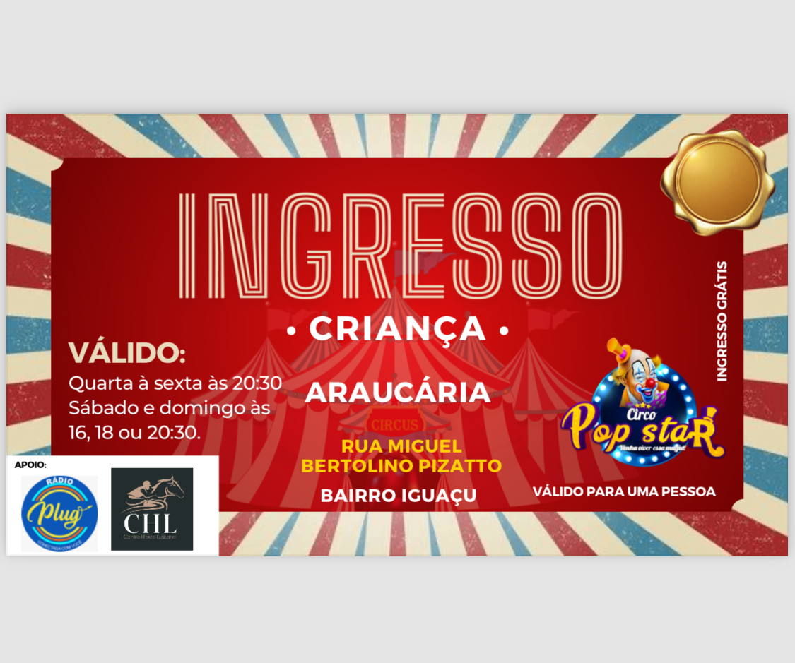 O circo Pop Star está em sua última semana em Araucária e junto com a CHL e a Rádio Plug estão dando a entrada de graça para as crianças.
